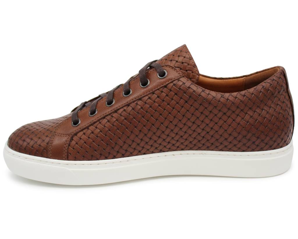 Contemporary chunky sneakers on a thick white rubber sole. Handmade from soft Italian leathers. Brown woven embossed leather upper combined with matching brown laces. Reinforced smooth leather multi-eyelet panel with lace fastening to give a firm, yet comfortable grip. Super soft genuine leather lining. Modern shape compliments all casual looks. Wide G-fitting.